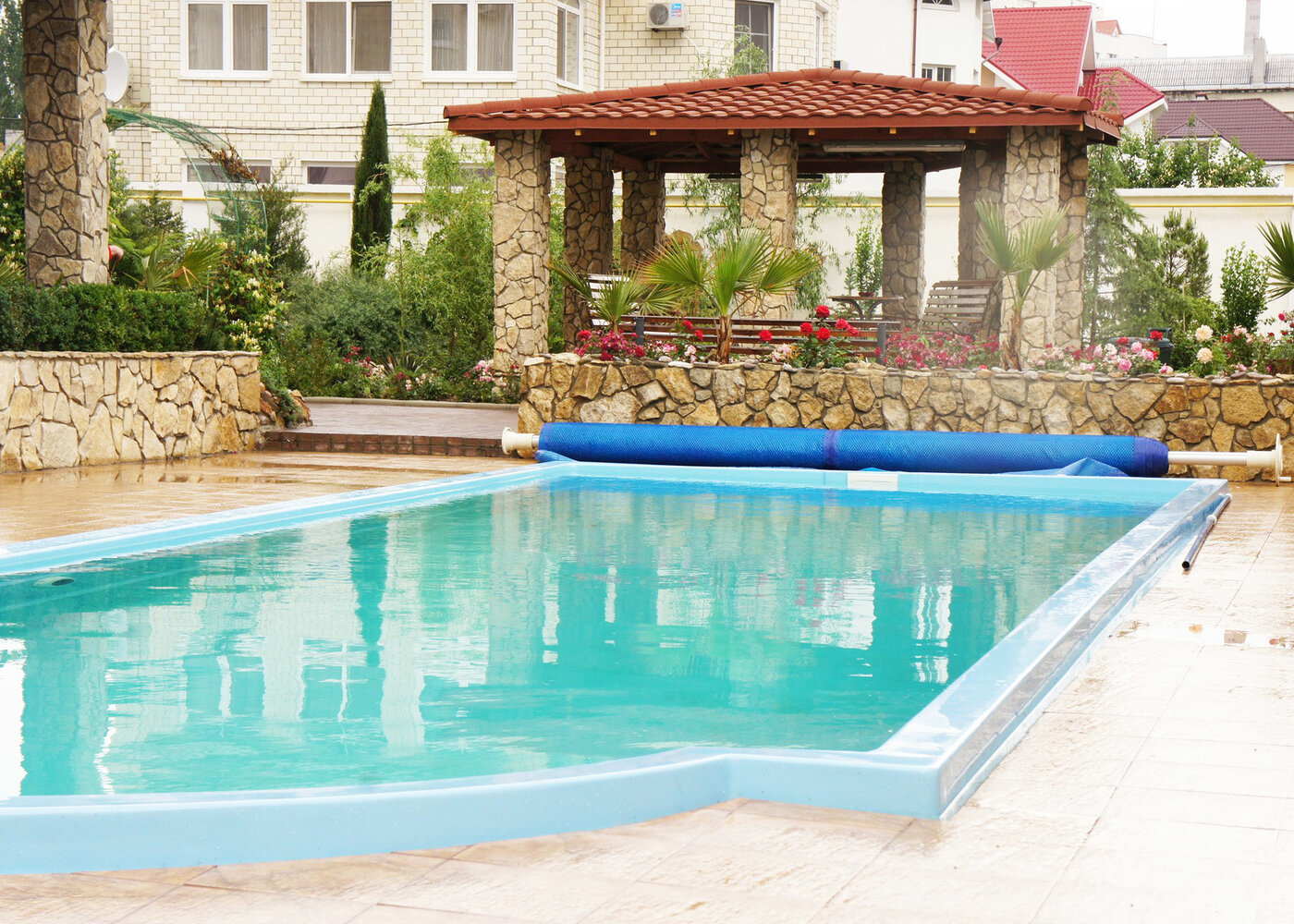 - В озеленённом дворе есть: беседка для отдыха, кухня, бассейн, лавочки, шезлонги, гамак, кресло качалка;