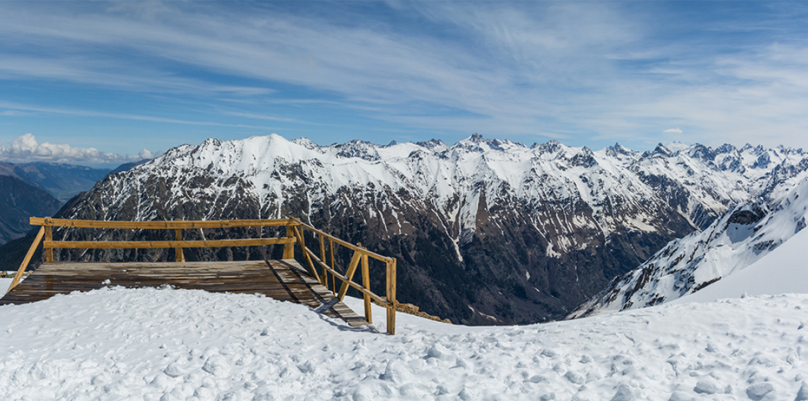 10:00 — Первая остановка: у подножия горы Чегет (поляна Чегет). Здесь предусмотрен подъем по канатным дорогам: 1-й уровень — кресельная канатная дорога на высоту 2750 м над уровнем моря. На склоне горы Чегет расположена обзорная площадка и уютное кафе (на высоте 2719 м). С площадки открывается удивительный вид: с одной стороны — посёлок Терскол, Баксанское ущелье, а с другой — Когутаи, Накру и Донгуз-Орун и ледник «Семерка». 2-й уровень — кресельная канатная дорога поднимает на высоту 3100 м и вы сможете увидеть вершины «седовласого великана» — Эльбруса. Время подъема на вершину горы Чегет занимает всего 20-30 минут.